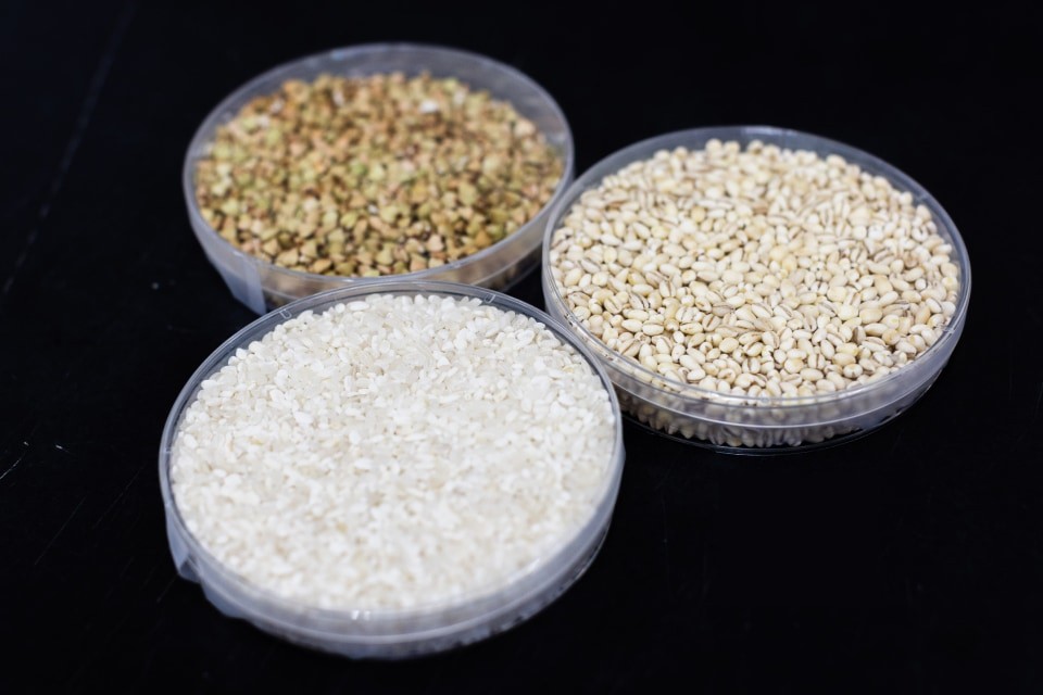 本格焼酎の原料には、そば・麦・芋・米を使用しています。それぞれの特徴を活かしたおいしい焼酎を造るために、原料の種類や品種に合わせて吸水や蒸しの時間、発酵温度、蒸留、ろ過方法を選定しています。また、新原料を使用する際は原料の成分組成や状態の分析をすることで、最適な仕込み方法の検討も行っています。