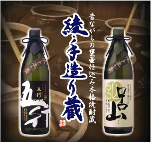 本格芋焼酎「五行」:芋の豊かで甘い香りと深みのある旨さ、黒麹かめ壷仕込みによる重厚でコクのある味わいの本格芋焼酎。 本格蕎麦焼酎「呂山」:香ばしいそばの風味と落ち着きのある力強い旨み、黒麹かめ壷仕込みによる重厚でコクのある味わいの本格蕎麦焼酎。